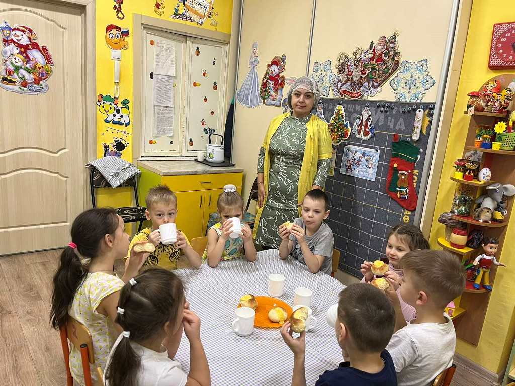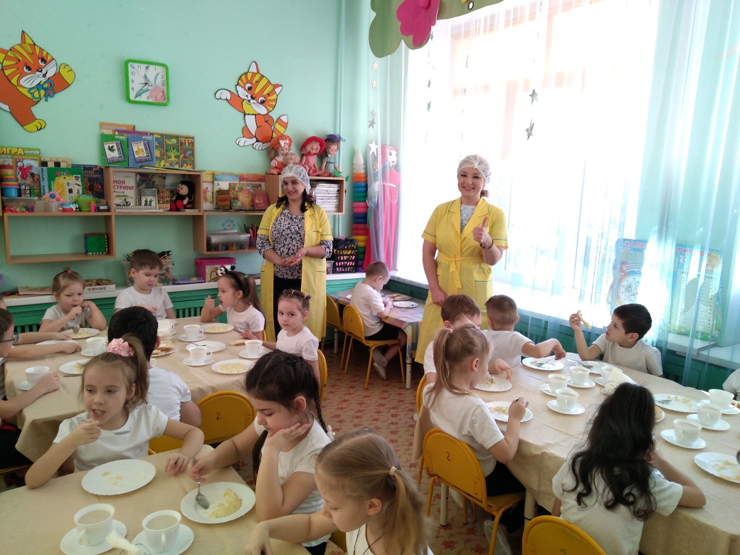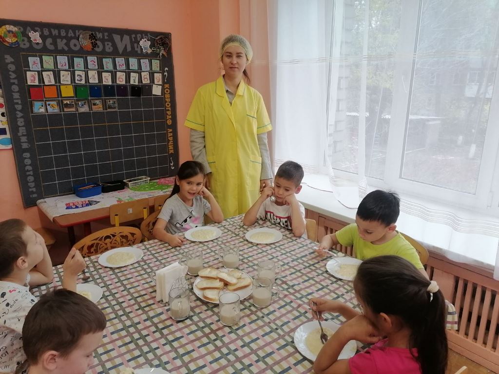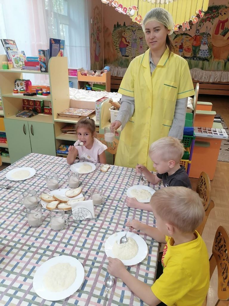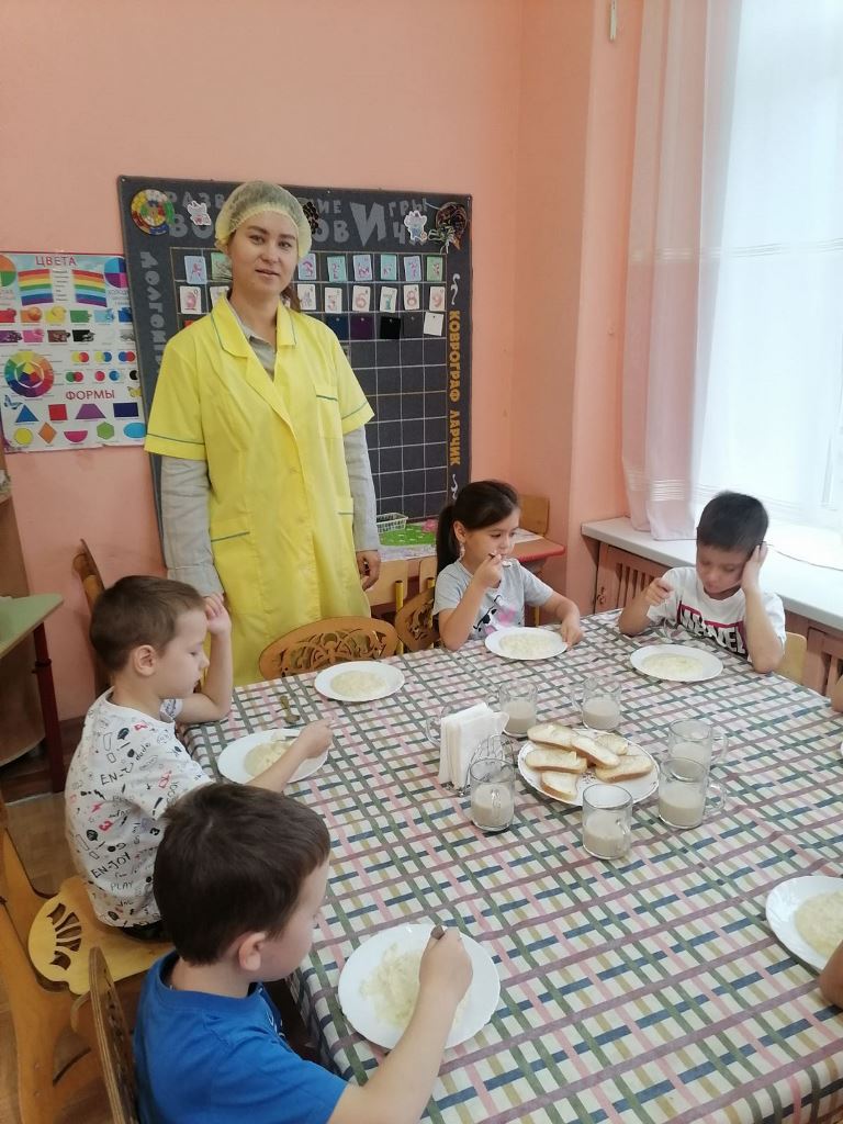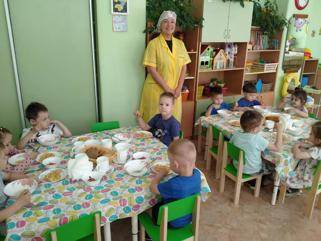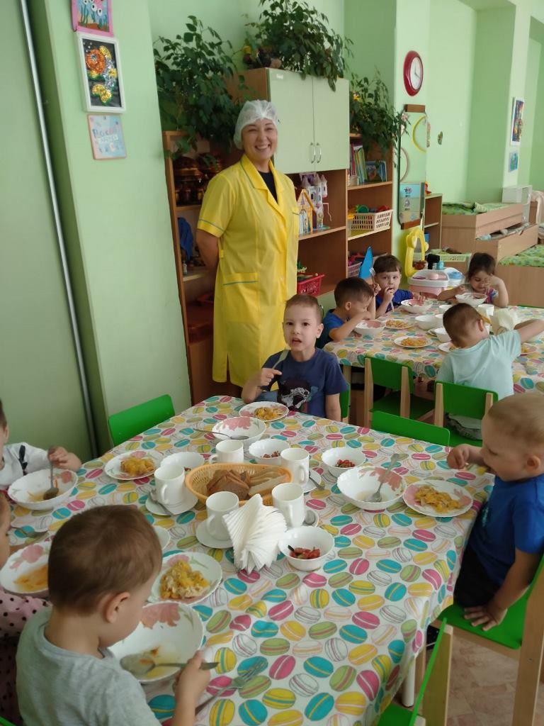 В детском саду имеется пищеблок, организован 4-разовый режим питания. Дети принимают пищу в групповых комнатах, где оборудованы специально отведённые места.